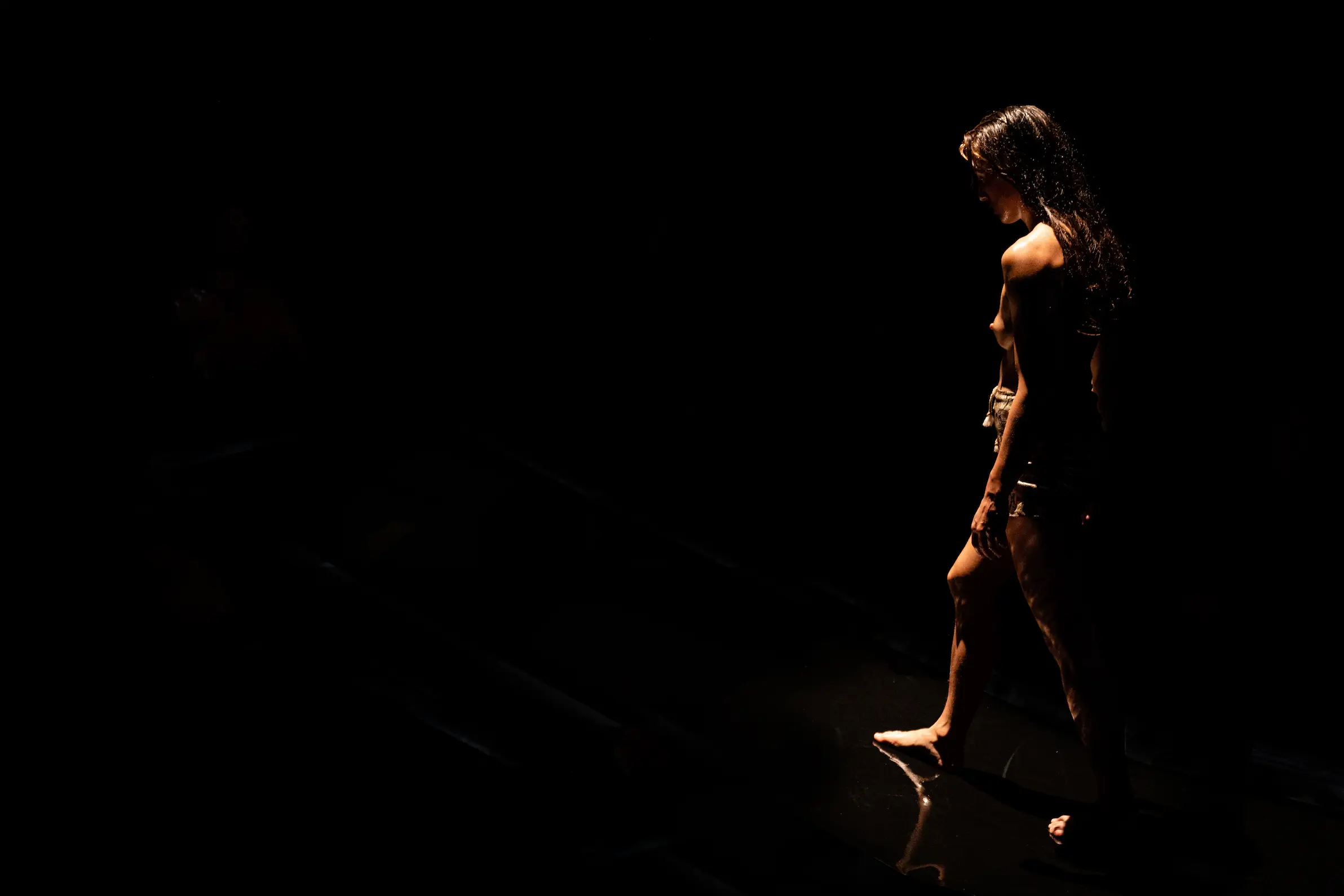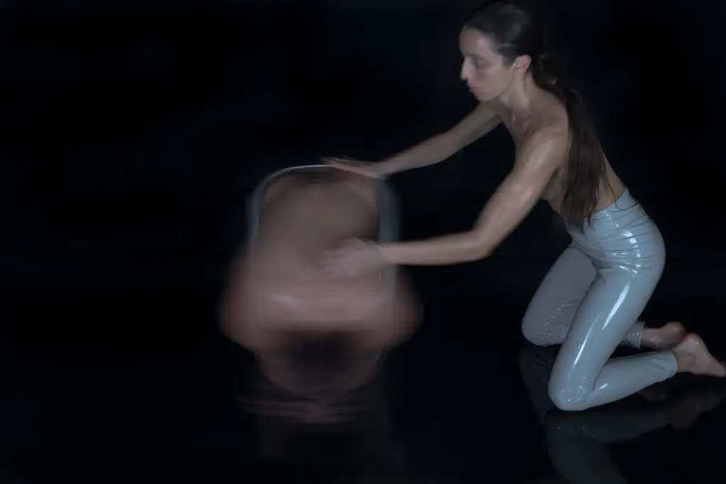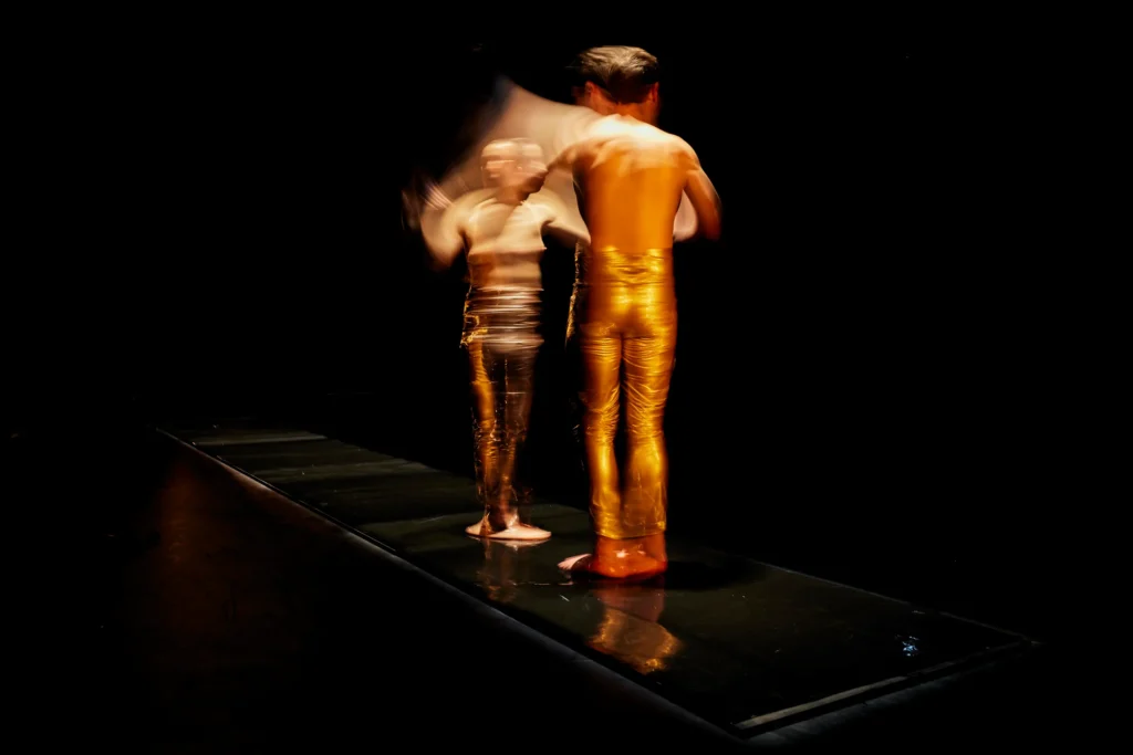 La peça es desenvolupa en un linòleum d’un metre d’ample per vuit metres de llarg cobert amb oli corporal, sobre el que desenvolupem un repertori de moviments i desplaçaments.